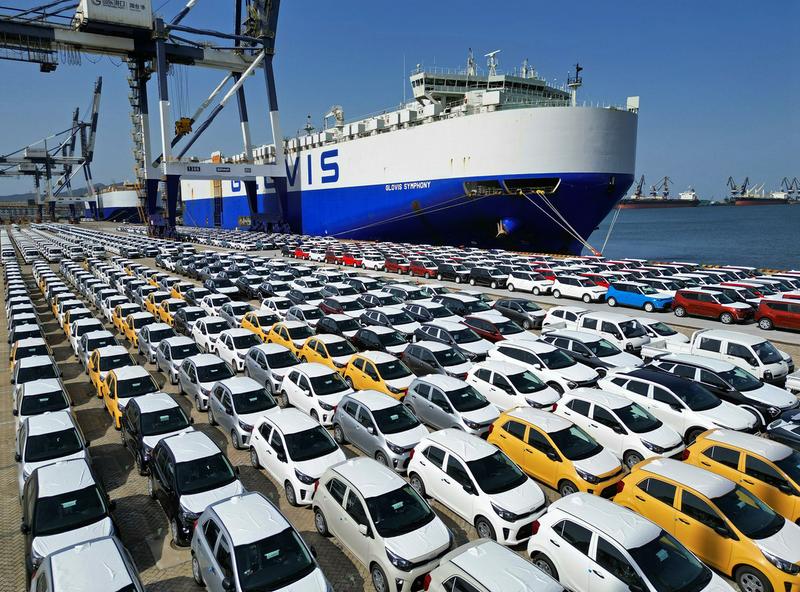 大批出口商品车集结山东港口烟台港准备通过汽车滚装船发运(2023年7月5日摄,无人机照片)。新华社发