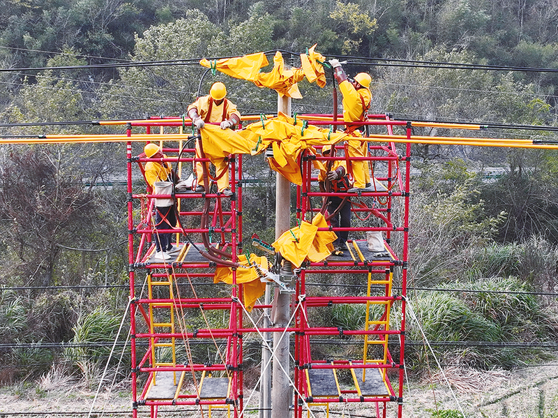 近日,国网石台县供电公司带电作业班首次成功运用绝缘脚手架,完成横渡镇10千伏红卫112线带电直线改耐张工作任务,为35千伏城关—兰关线路改造工程年底建成投运提供保障。图为工作人员正在进行绝缘脚手架作业。