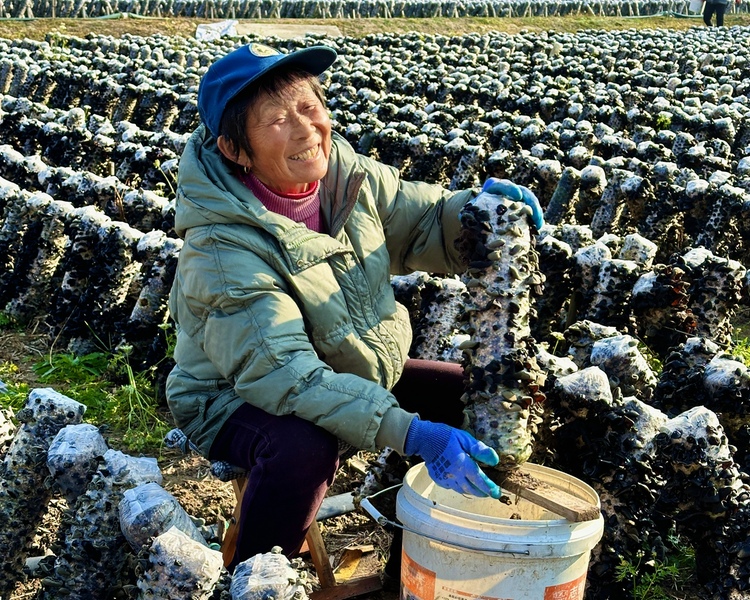 近年来,里山街道解放社区立足特色资源禀赋打造“一村一品”,引导扶持村民种植黑木耳近80万棒,总产值近160万元,有效带动了当地闲置劳动力就业。图为村民在采摘黑木耳。