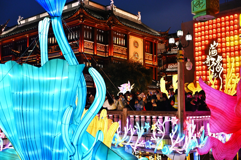 当日,2024上海豫园民俗艺术灯会正式亮灯。今年豫园灯会续写“山海奇豫记”,以“海经篇”为主题,生肖龙灯、海底世界、鱼群起舞、奇幻仙境等场景让游客在灯火绚烂的国风幻境中喜迎龙年新春。 新华社记者 刘颖摄