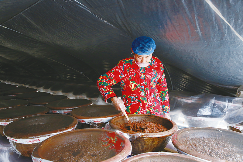 随着时间的变迁,制酱的工艺从传统走向机械化、智能化,酱的品种也越来越丰富。唐长江说:“如今,村里已经将原来的茶厂租赁给企业,帮助企业扩大生产,在发扬传统技能的同时走向规模化生产,带动更多村民就业,让更多村民能留在家乡、建设家乡。”