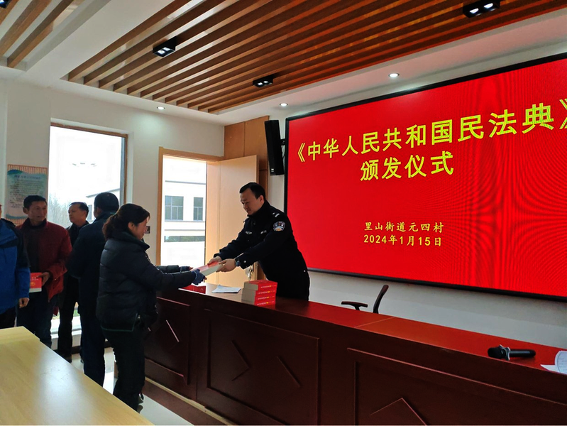 1月15日,里山街道元四村开展《民法典》普法宣传活动,为部分村民现场送上《民法典》小红本,普及婚姻家庭、电信诈骗、工资拖欠、农村土地流转和宅基地等方面的法律知识。近年来,作为省级民主法治示范村的元四村积极与当地派出所、司法所等部门合作,开展各类普法宣传活动20余次。