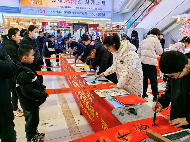 近日,市妇联主办的“把爱带回家——真情暖童心 相伴护成长”2024寒假儿童关爱服务暨“迎新春写春联送祝福”活动在池州商之都购物中心举行。图为活动现场。