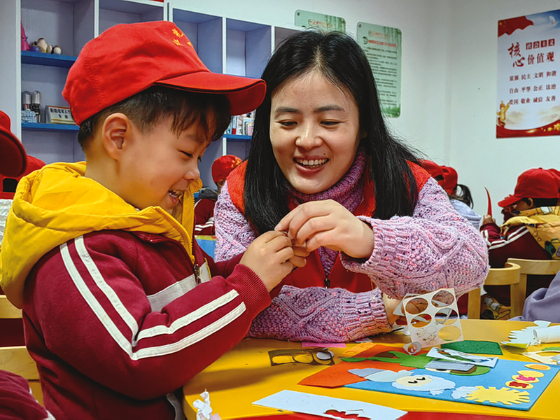 图②3月5日,池州市烟草专卖局联合贵池区池阳街道烟柳园社区新时代文明实践站开展“巧手创童梦 雷锋在我心”活动。图为志愿者在红光幼儿园教儿童制作手工贴画。 记者张艺楠 摄