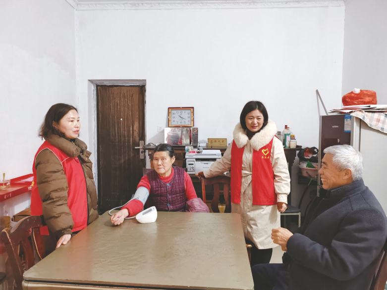 图④3月5日,东至县尧渡镇兰溪社区工作人员上门帮助辖区行动不便老年人测量血压、打扫卫生,了解他们日常生活及身体情况。 通讯员程洪昱 摄