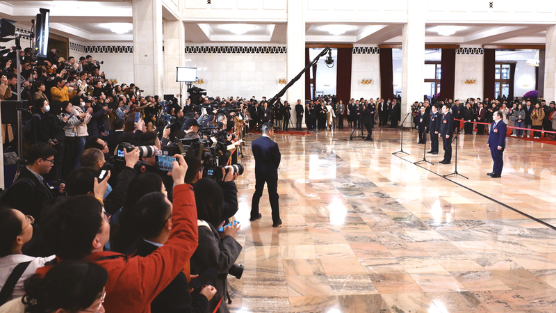 3月4日,全国政协十四届二次会议首场“委员通道”集体采访活动在北京人民大会堂举行。新华社记者 李贺 摄
