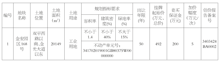 2.挂牌起始价492万元(总价),加价幅度为5万元/次;3.竞得人取得土地使用权后,须与池州经济技术开发区管委会签订《工业项目用地投入产出监管合同》