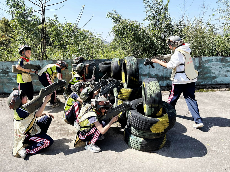 近日,矶滩中心学校全体学生走进龙腾山军事文化体验基地,开展国防教育研学实践活动。学生们在教官的带领下,体验模拟射击训练,零距离感受国防教育魅力。图为学生体验真人CS户外野战活动现场。