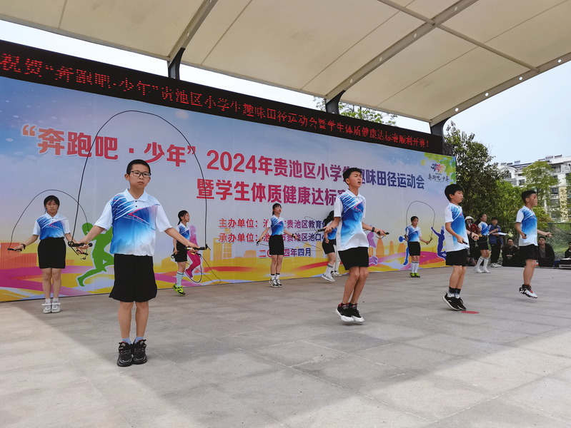 4月20日上午,“奔跑吧·少年”2024年贵池区小学生趣味田径运动会暨学生体质健康达标赛在池口小学举行。此次比赛形式多样,短跨接力、十字跳、50米跑等项目精彩纷呈,孩子们在竞技中增强了团队合作意识,感受到运动的快乐。图为跳绳比赛现场。