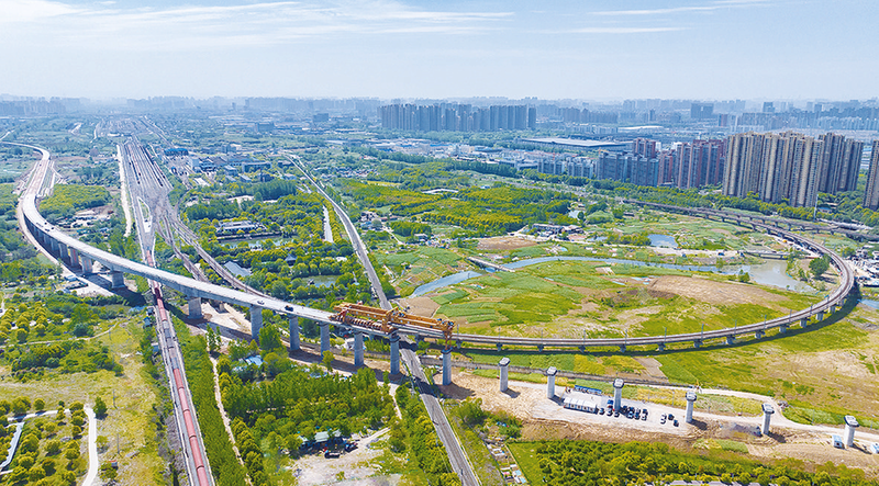 这是合新铁路上跨既有铁路淮南上行线架梁施工现场(4月24日摄,无人机照片)。