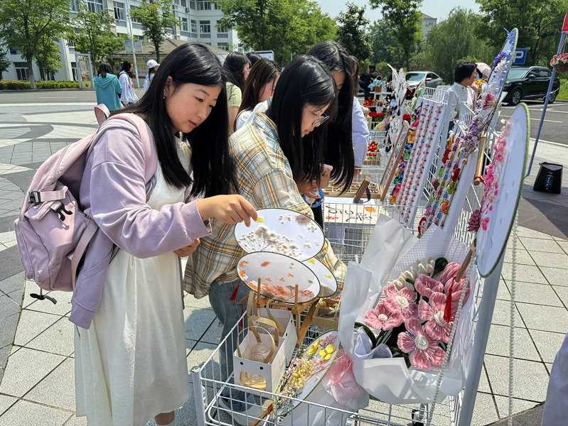 精巧的珍珠手拎包、漂亮的手串、可爱的布织玩偶、精美的油画……一个个精美而又不乏实用价值的纯手工艺品让师生们大为赞叹。“我买了几朵用毛线做的康乃馨,看起来非常精致,准备在母亲节送给妈妈。”该校医疗卫生技术系医美专业学生翟雯悦对刚买的工艺品爱不释手。