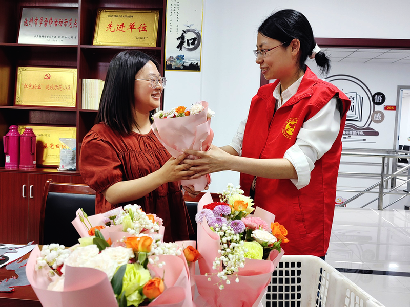 ▲5月9日,贵池区清风街道翠百社区举办了感恩母亲主题活动,吸引众多附近居民参加。图为社区工作人员向居民赠送鲜花。