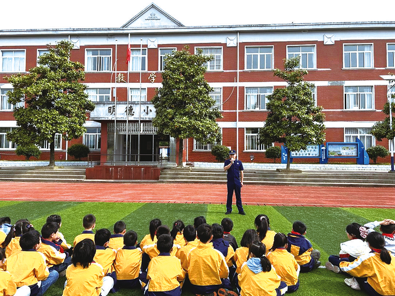 在全国第16个防灾减灾日到来之际,为提高师生们的防震减灾意识和自救能力,5月9日上午,陵阳镇中心小学组织开展防震演练。图为消防员讲解防震方面的知识。 通讯员汪甜甜 摄