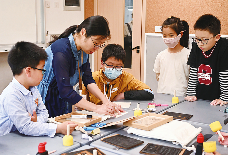 5月19日,在上海市逸夫职业技术学校,小学生们在体验活字印刷。