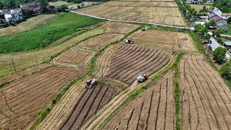 近日,青阳县小麦进入收获期,机械化作业大幅提高了收割效率。图为4台收割机正在木镇镇双云村的800亩麦田内作业。