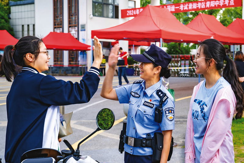 6月7日早晨,在青阳县青阳中学考场安检入口,青阳县公安局执勤民警与考生击掌鼓励。
