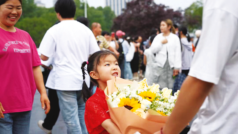 6月9日,东至县各考点大门前成了鲜花的海洋,家人们用鲜花和微笑迎接考生。