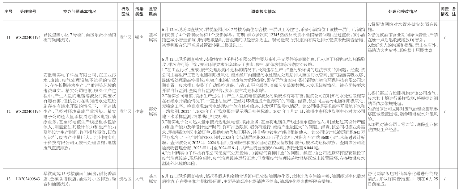 安徽省第一生态环境保护督察组6月11日(第十批)交办我市的13件信访件,截至6月17日,已办结3件。经查,基本属实的5件、部分属实的8件,不属实的0件;责令整改13件、立案处罚0件、拘留0人、问责0人、约谈0人。