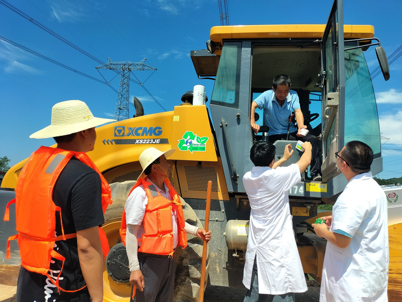 7月7日,青阳县蓉城镇分姚村姚家圩圩堤上,来自该镇卫生院的医护人员给压路机驾驶员送去防暑降温药品。