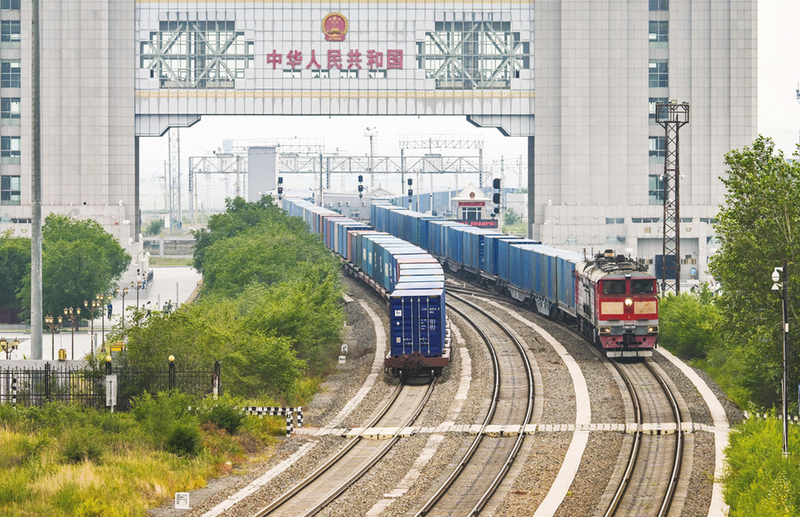 两列对向行驶的中欧班列货运列车在内蒙古满洲里铁路口岸国境处会车。