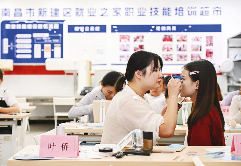 学员们在江西省南昌市新建区就业之家进行美容化妆练习(9月12日摄)。 新华社记者 隋尚君 摄