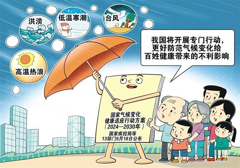 国家疾控局等13部门9月18日公布《国家气候变化健康适应行动方案(2024—2030年)》,提出到2025年,健全完善多部门气候变化与健康工作协作机制;到2030年,气候变化与健康相关政策和标准体系基本形成。这意味着,我国将开展专门行动,更好防范气候变化给群众健康带来的不利影响。气候变化可能给健康与公共卫生带来影响和风险,作为易受气候变化不利影响的最大发展中国家,主动适应气候变化是我国当前面临的现实而紧迫的任务。要制定平急结合的极端天气气候事件应急预案,开展多部门参与的联合演练,提升自然灾害下的卫生应急处置能力,增强卫生应急救治能力,不断筑牢气候变化下的“健康屏障”。