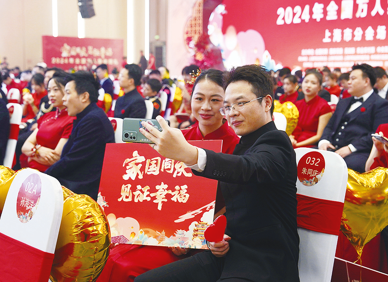 9月22日,新人在“家国同庆 见证幸福”2024年全国万人集体婚礼上海分会场自拍留念。 新华社发(程志兵 摄)