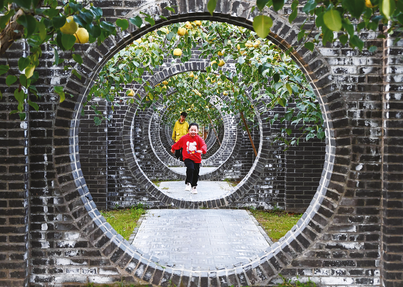 10月6日,小朋友在安徽省宿州市砀山县一处梨园景区内玩耍。