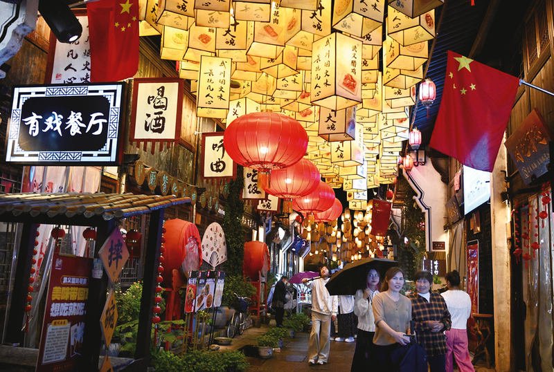 10月6日,游客在浙江省武义县张灯结彩的古城老街游览。