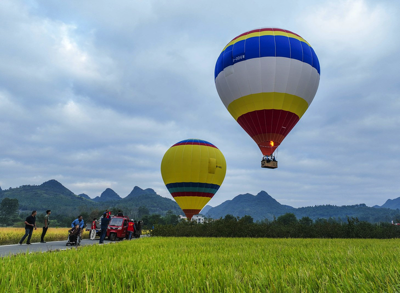 10月6日,游客在湖南省永州市宁远县湾井镇乘坐热气球,观赏田园美景(无人机照片)。不少“奔县”旅游者选择奔向县城和郊区休闲游玩,享受“慢时光”。