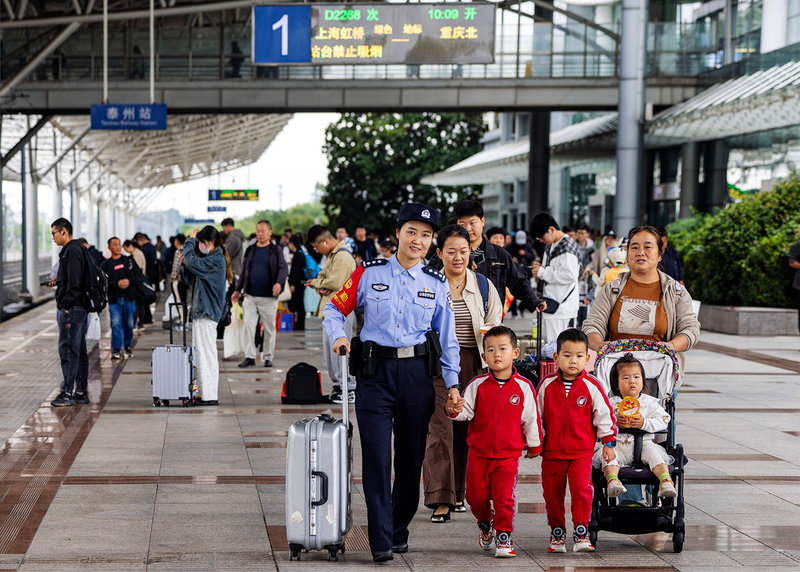 10月6日,江苏泰州站派出所民警帮助旅客进站乘车。 新华社发(汤德宏 摄)