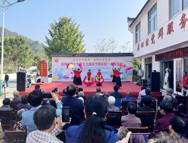 夕阳无限好,人间重晚晴。近日,七都镇启田村第十九届“九九重阳节暨村民一家亲”活动在村民活动中心举办,村民们载歌载舞,共度重阳佳节。图为活动现场。