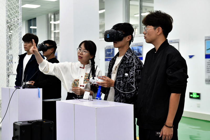 10月9日,在山东航空学院智能无人机实验室,李洁老师(中)在指导航空工程学院的学生进行无人机模拟飞行训练。