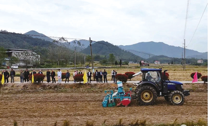 近日,市、县两级农业部门在尧渡镇举行秋种工作现场会,农技专家现场指导秋收秋种工作。图为尧渡镇禾丰村万松家庭农场开展油菜机械化精量播种示范现场。