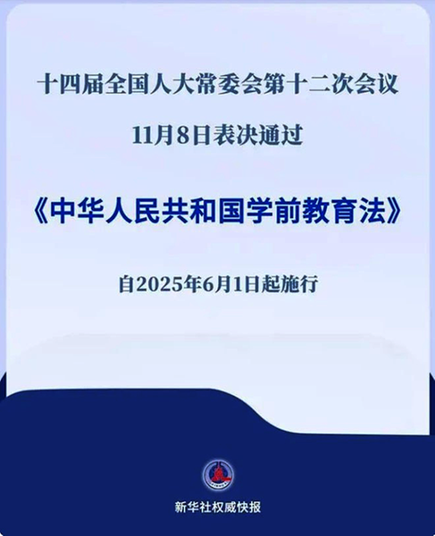 11月8日,十四届全国人大常委会第十二次会议表决通过了《中华人民共和国学前教育法》,共9章85条,将自明年6月1日起施行。
