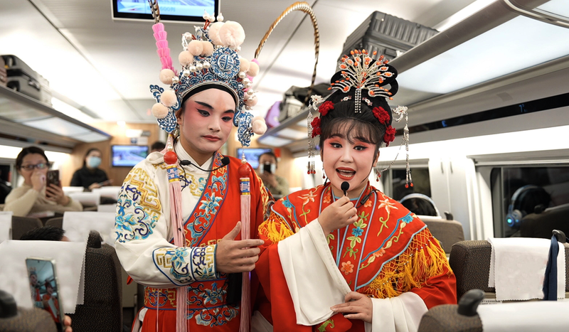 本次活动通过高铁专列,将池州的文旅资源直接带到了游客身边。推介形式新颖多样,不仅有“诗人李白”沉浸式推介池州,还有主持人与游客的默契互动问答,更有国家级非物质文化遗产青阳腔、省级非物质文化遗产九华民歌表演等环节,让游客在轻松愉快的氛围中深入了解池州的文化和旅游资源。图为池州非遗传承人为游客表演青阳腔。
