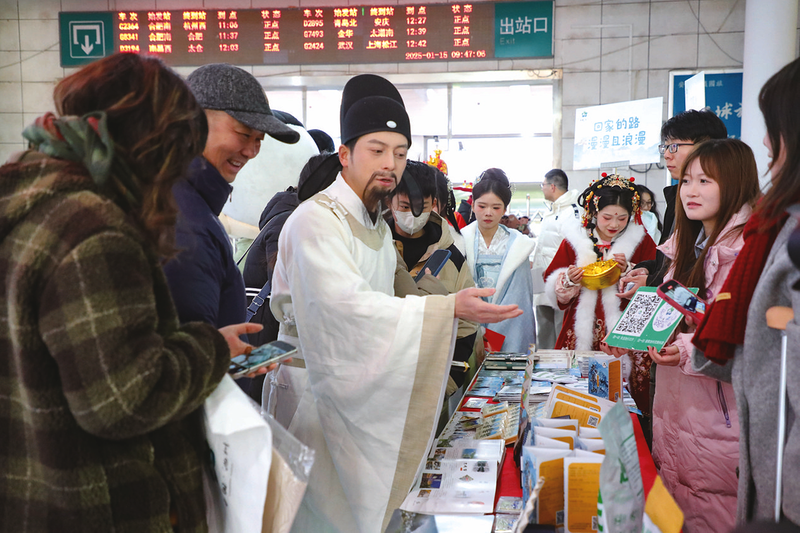 为促进文旅消费,营造喜庆热闹的节日氛围,市文化和旅游局、团市委于1月15至17日策划举办学子归乡,“池妈”相迎——“欢欢喜喜过大年”花式接站活动。在池州火车站出站口,文化志愿者们扮成牧童、李白等特色NPC人物与游客互动合影,发放文创产品、景区门票、特色美食等。图为NPC李白与游客互动并发放文创产品。 记者 张延鹤 摄
