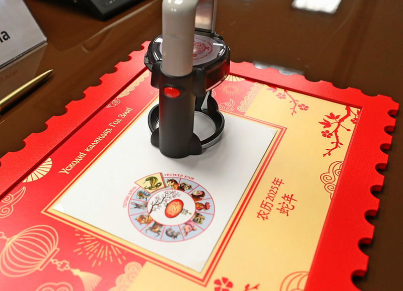 白俄罗斯《东方历法:蛇年》邮票和首日封发行仪式15日在白国立大学孔子学院举行。《东方历法》系列邮票由白俄罗斯通信与信息化部和白俄罗斯国立大学孔子学院共同推出,今年是按照十二生肖顺序推出的第六套该系列邮票。 新华社发(任科夫 摄)
