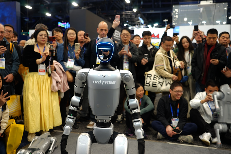 1月8日,在美国拉斯维加斯消费电子展上,人们在宇树科技展区观看机器人展示。