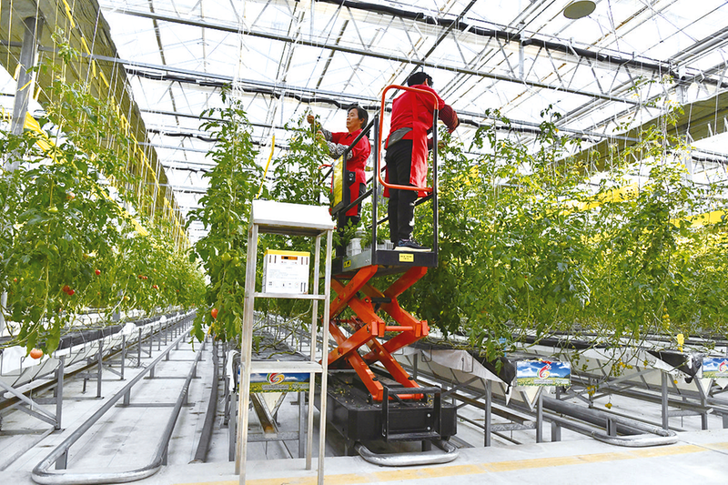 2024年3月19日,蔬菜种植户在山东省潍坊市寒亭区的智能温室大棚里进行管护作业。 新华社记者 徐速绘 摄