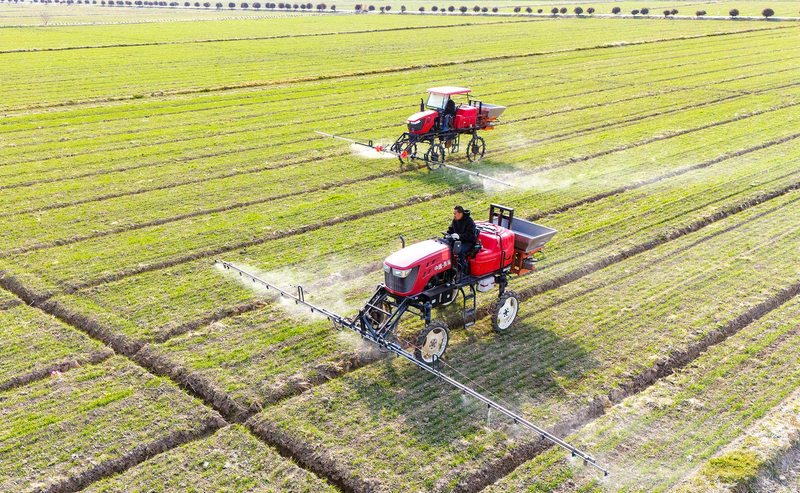 2025年2月20日,在江苏省南通市通州区十总镇育民村高标准农田,农民驾驶植保机械对进入返青期的小麦开展病虫害防治作业(无人机照片)。新华社发