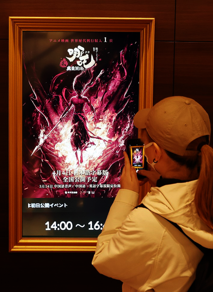 3月14日,在日本东京,一名观众拍摄影院中的《哪吒之魔童闹海》宣传海报。