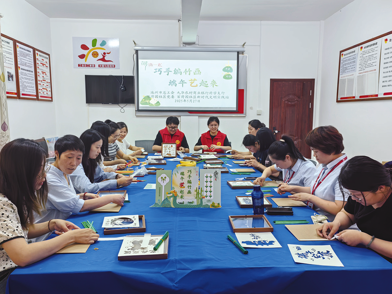 5月27日,贵池区清风街道百荷园社区开展“巧手编竹画 端午艺起来”非遗竹编画手工体验活动。图为社区居民在志愿者的指导下认真学习竹编技艺。 记者 杜龙菲 摄