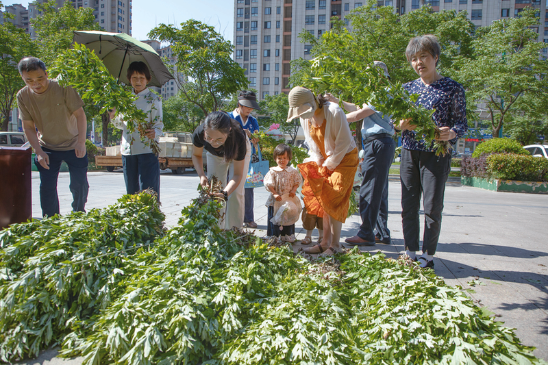 ▲ 5月30日,团贵池区委、安徽耕一亩农业发展有限公司、贵池区青年创业者协会联合开展万株野生艾草免费派送活动。图为市民在主城区盛唐超市(福达园店)门口领取艾草。 记者 盛文鹏 摄