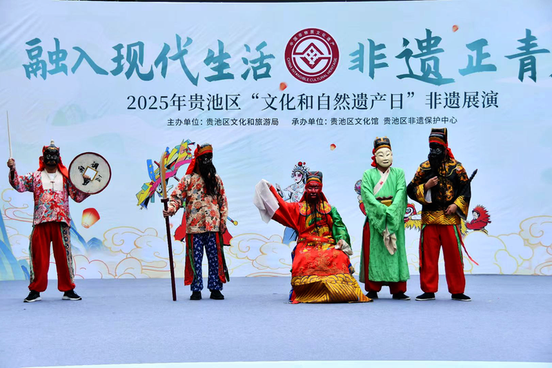 6月29日,贵池区文化和旅游局在主城区秀山门广场举办“ 融入现代生活 非遗正青春”2025年贵池区“文化和自然遗产日”非遗展演活动。本次展演聚焦“活态传承”,池州傩戏、贵池民歌等10个节目精彩亮相,让观众近距离感受非遗的独特魅力。
