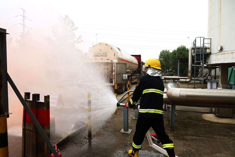 本次演练模拟液氧槽车充装过程中发生泄漏,遇静电引发燃烧,现场有一名操作人员被低温液氧冻伤并吸入高浓度氧气中毒昏迷。发现险情后,值班人员立即按照应急预案要求,向单位负责人报告,并采取关闭槽车尾部紧急切断阀、设置警戒区域等应急措施。整个演练过程紧张有序,为应对突发事故积累了宝贵经验。 记者 齐蕾 摄