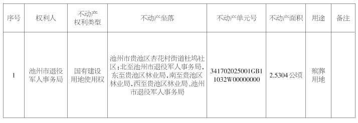 池州市烈士陵园纪念墙至纪念塔地块,坐落于池州市贵池区杏花村街道杜坞社区,占地面积2.5304公顷。根据市退役军人事务局提供的资料以及《确定土地所有权和使用权的若干规定》,该宗地应属国有土地。我局拟依照开展烈士陵园不动产登记专项工作的文件精神,现对市退役军人事务局委托第三方开展的地籍调查结果予以公告,公告期15个工作日。如有异议,请将异议书面材料送达指定地址。公告期满权属清晰无异议或者异议不成立的,我局将按程序上报市政府同意后完善用地手续并办理不动产登记。