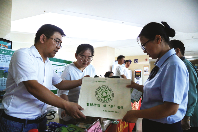 8月15日,我市在市政务服务中心开展2025年全国生态日主题宣传活动,主题是“绿水青山就是金山银山”,通过设置展板、发放宣传材料等形式,宣传节能降碳、“以竹代塑”、粮食节约、绿色出行、绿色建筑、绿色农业等知识,引导全社会牢固树立“绿水青山就是金山银山”理念,积极践行绿色低碳生产生活方式。图为工作人员向市民普及环保知识。 记者 左泽川 摄