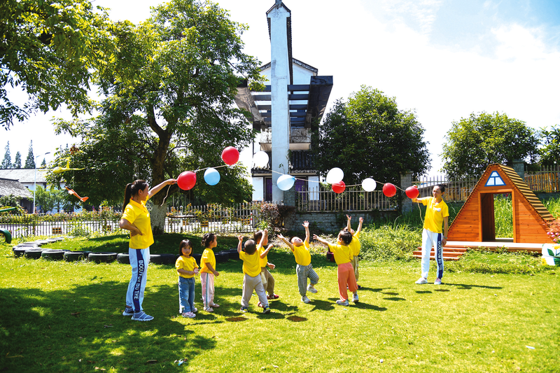 9月5日,四川泸州白酒产业园区天骄托育园的老师带领孩子们做游戏。新华社记者 江宏景 摄