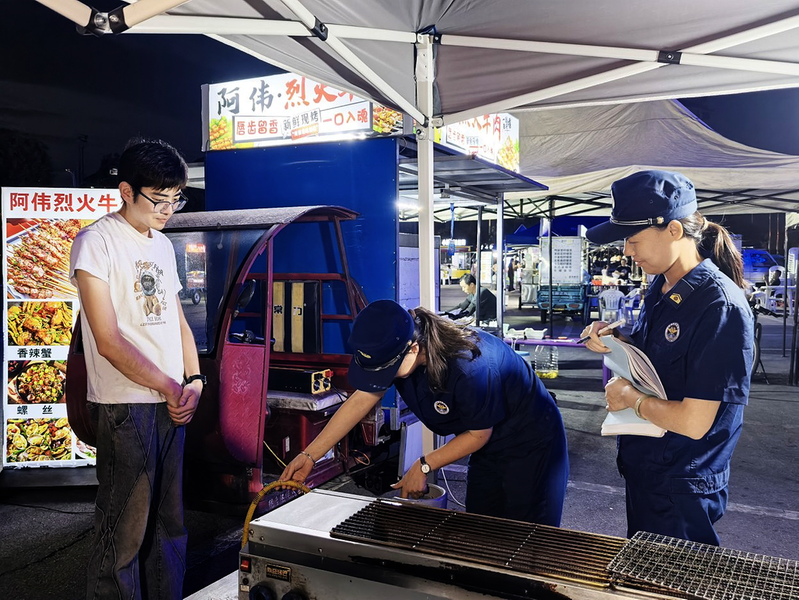 近日,市城市管理局平天湖风景区分局联合贵池区清溪街道,对平天湖数字经济产业园广场夜市明火摊位开展消防安全检查。工作人员详细讲解消防安全操作规范,督促摊主落实主体责任要求,共同营造安全、有序、文明的夜市环境。 记者 方雯 摄